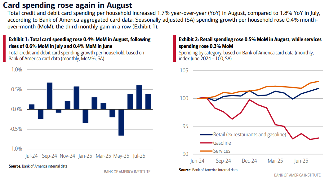 Consumer spending slipped slightly but remained resilient overall in August, rising 1.7% year-over-year after a 1.8% increase in July. Spending was broad-based across both goods and services, signaling that household demand has held steady despite ongoing economic pressures. However, inflation and the unemployment rate ticked higher during the month, and recent revisions to government jobs data pointed to cracks in the labor market.