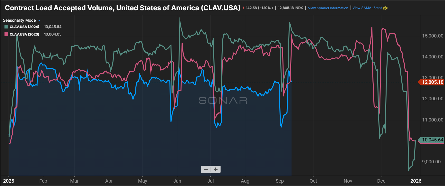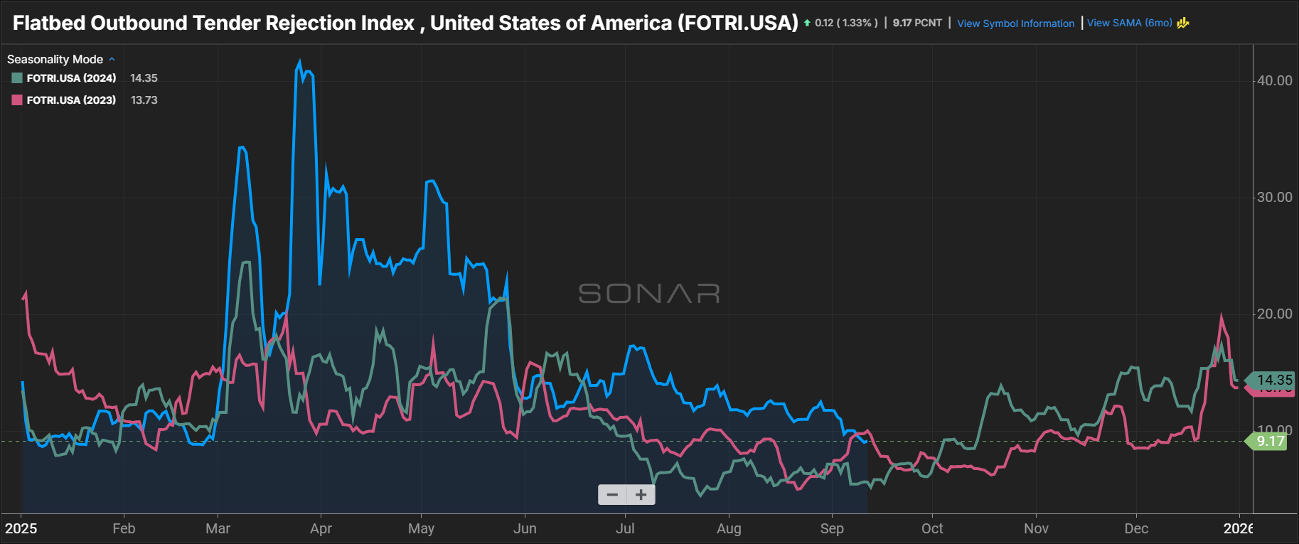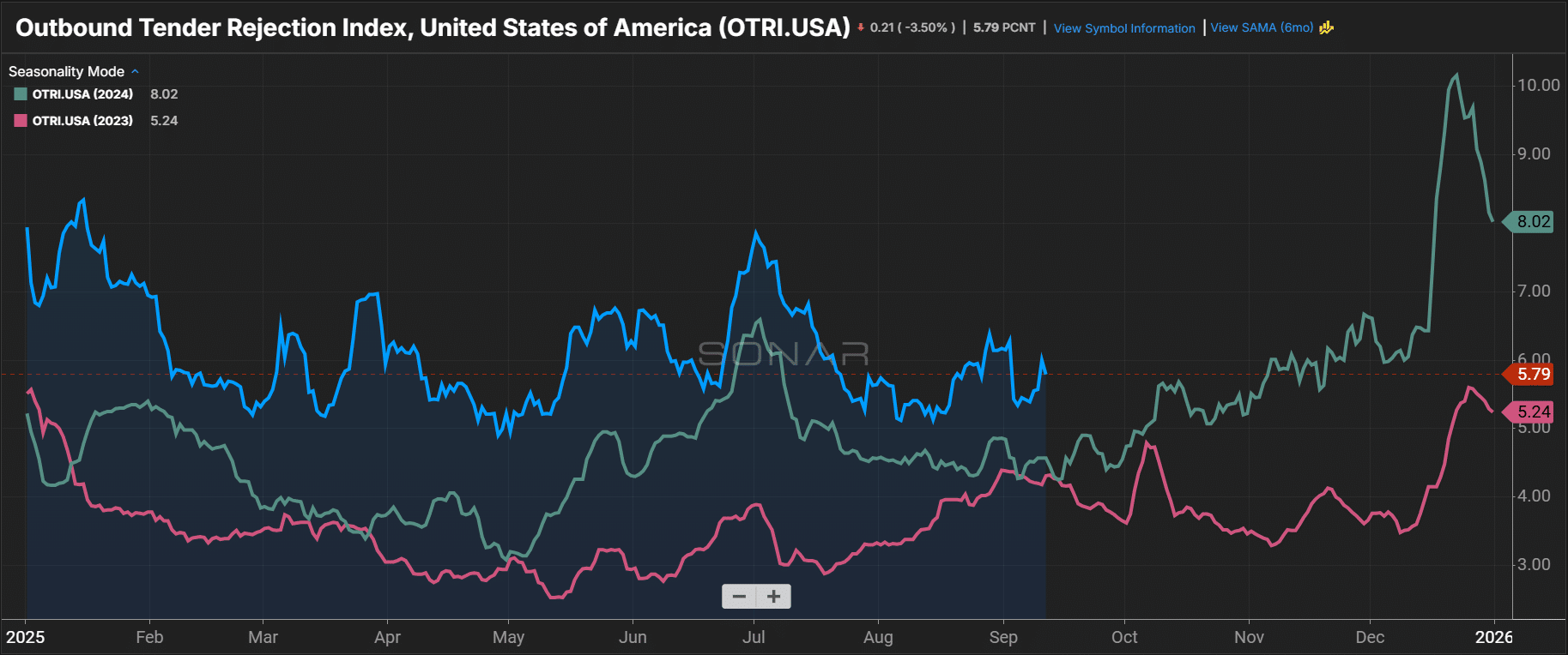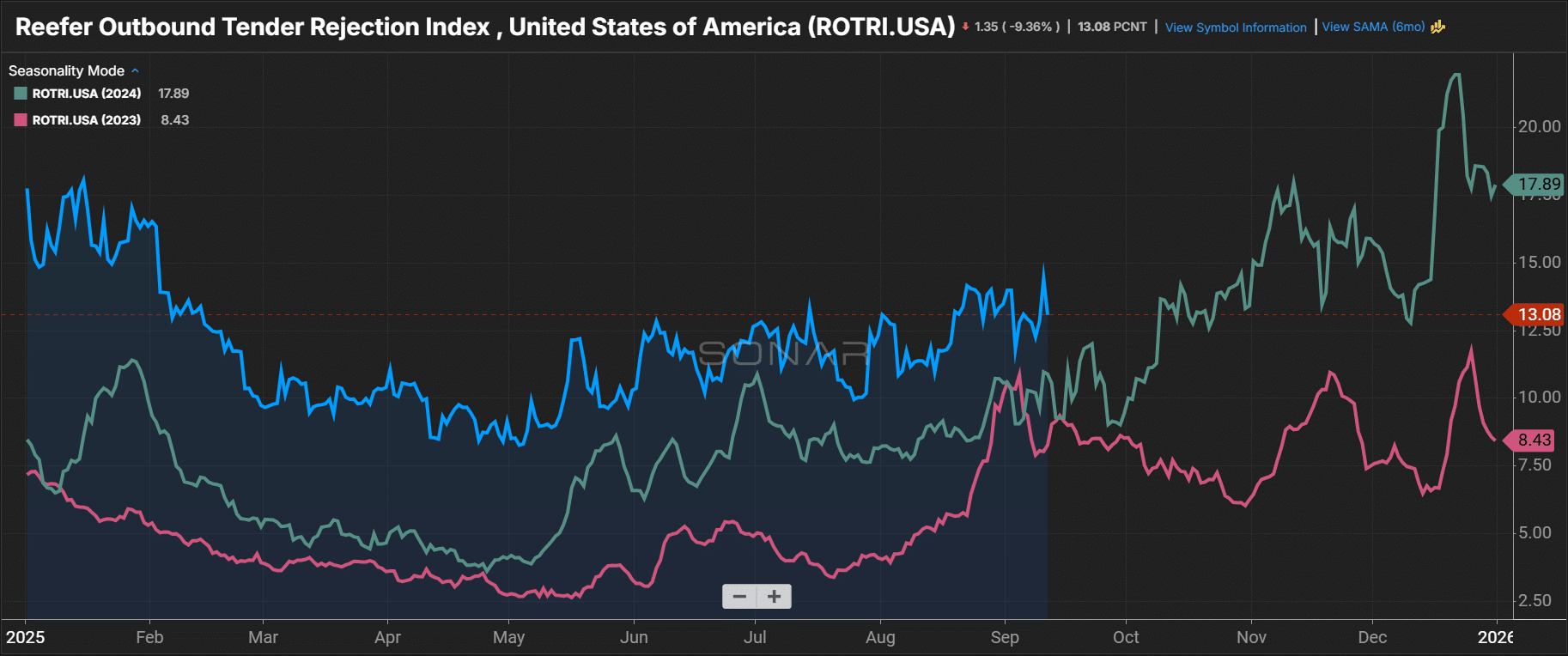 Capacity showed a slightly earlier and stronger response to Labor Day demand this year, contributing to regional tightness that lingered into early September. Those pressures have since mostly eased, with van and reefer rejection rates returning to typical seasonal patterns by mid-month.