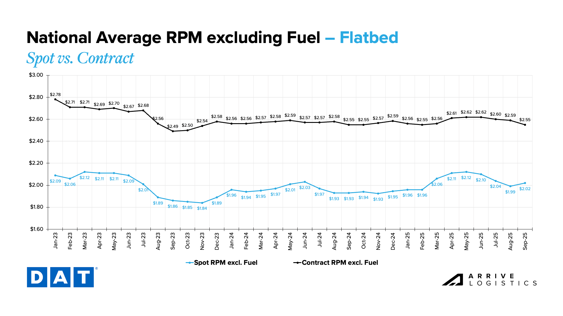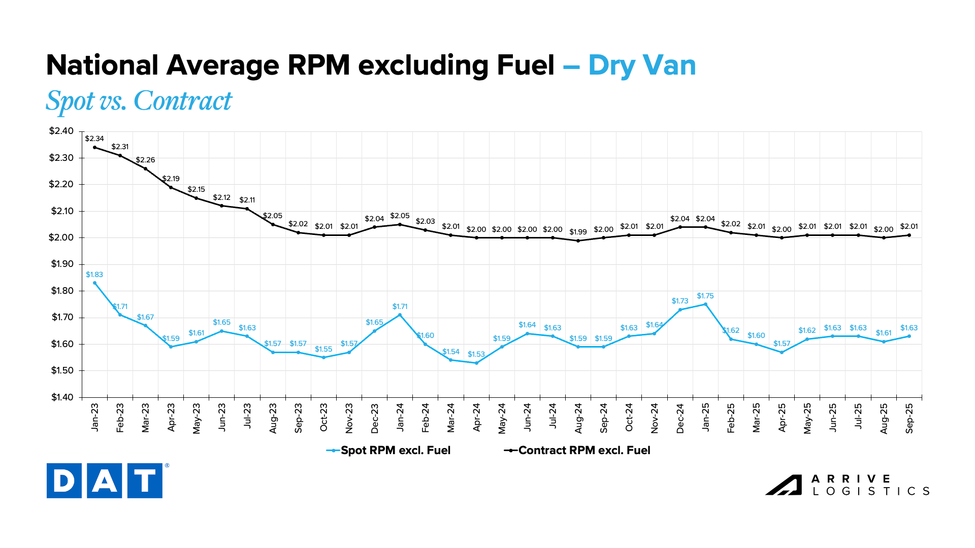 Spending strength should continue to support freight demand in the near term, but inflation and labor market softness pose risks to the outlook. The Federal Reserve cut interest rates by 25 basis points in its September meeting, but any meaningful impact on freight demand would take time — and likely require several more cuts — to materialize. For now, consumer activity remains a bright spot, though rising prices and labor uncertainty may create challenges as we approach year-end and move into 2026.