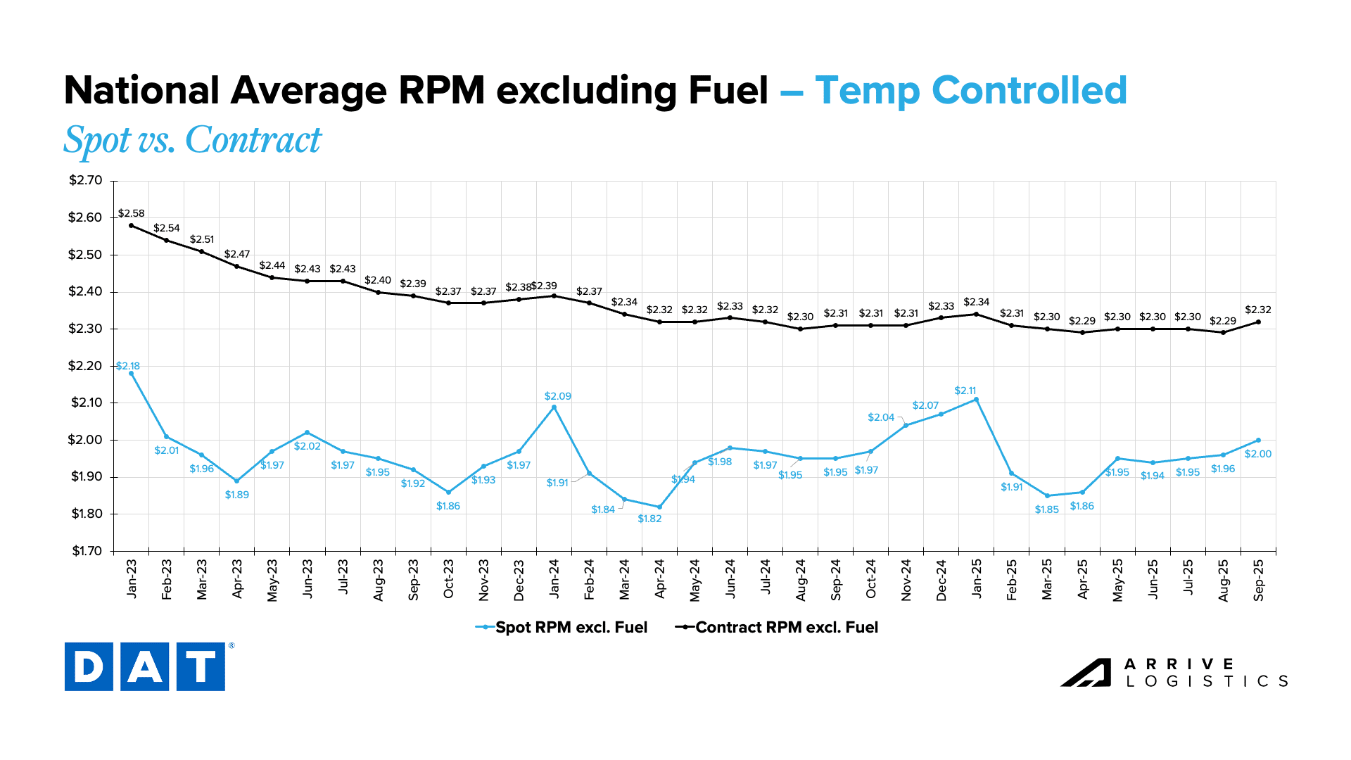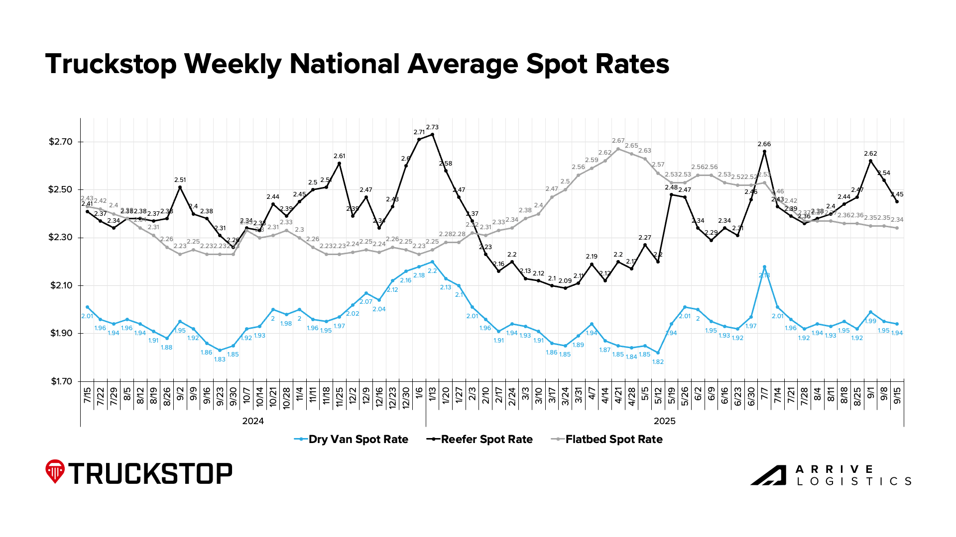 Van and reefer rates both spiked around Labor Day, showing a slightly stronger and longer-lasting response than usual before easing back into typical post-holiday softening by mid-month. Trends were broadly consistent with last year despite variables like lingering import flows and northern produce pockets.