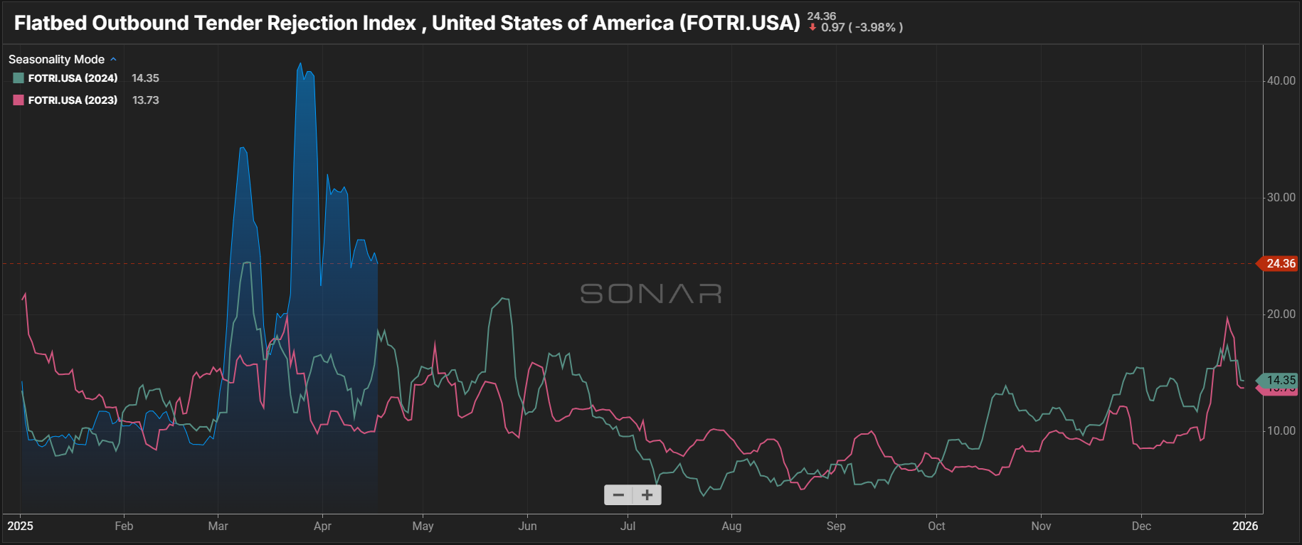 The sharp rise in flatbed rejections and load-to-truck ratios—driven by tariff-related demand coinciding with the onset of flatbed peak season—could offer early insight into what to expect during the summer peak for van and reefer equipment. As freight volumes remain elevated, rejection rates and spot rate volatility are likely to surpass 2024 levels.