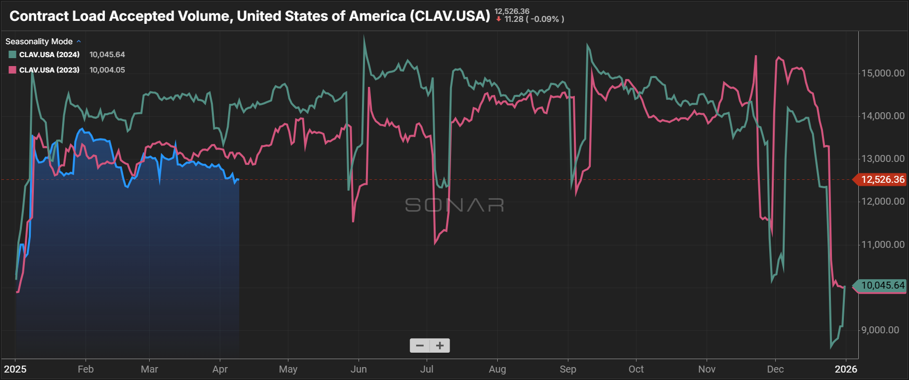 Demand weakness has created a moving target in the balancing of the truckload freight market. This is reflected in the ongoing decline of the Contract Load Accepted Volume Index (CLAV) since October 2024 and further illustrated by Cass Freight Index data, which shows a 5.3% year-over-year and 8.7% two-year stacked decline in shipment volumes.