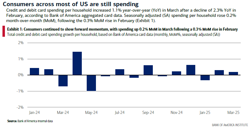 Consumer spending has shown modest growth, even though sentiment indicators have trended somewhat negatively. That contrast suggests households are still willing to spend, particularly on essentials, though discretionary spending has shown some early signs of softening amid economic concerns among consumers.
