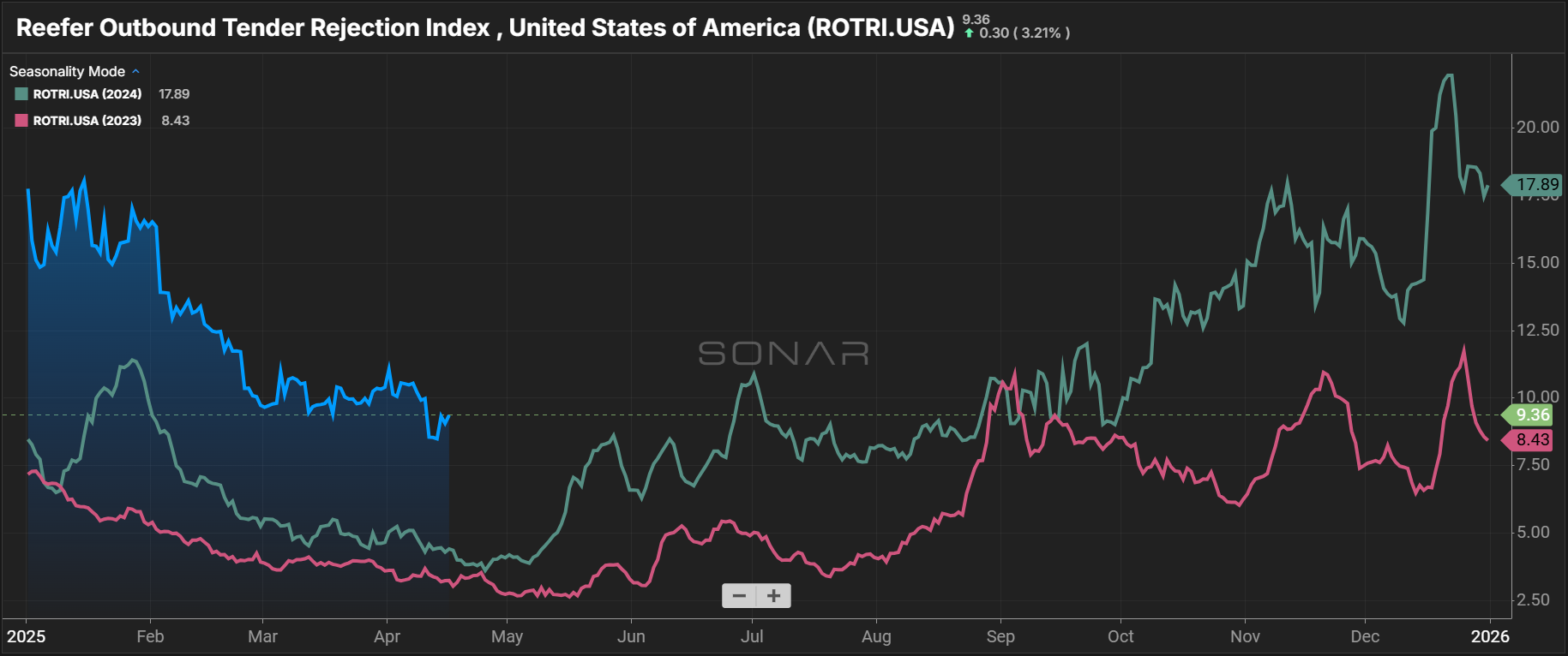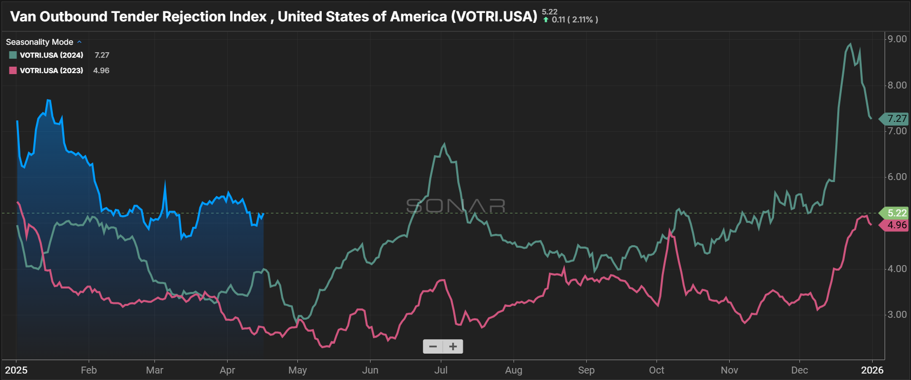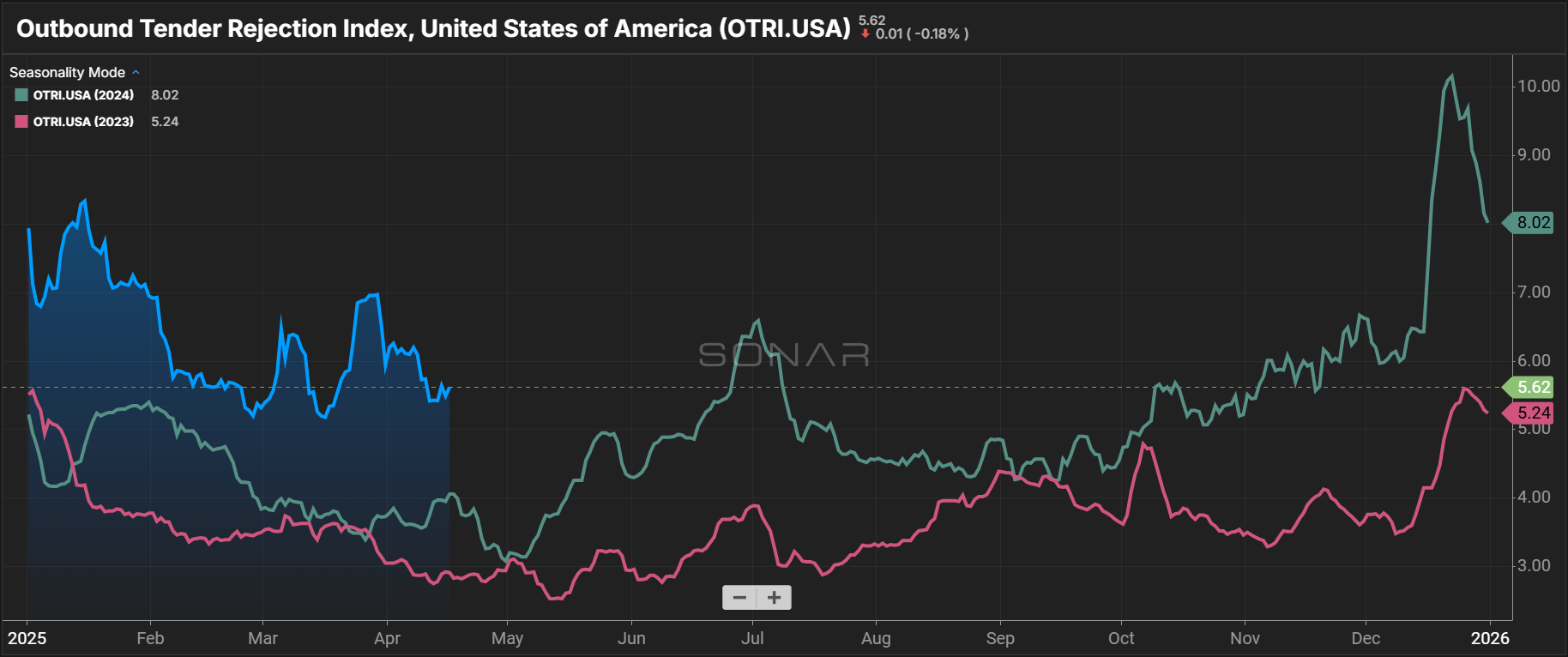 Seasonal rate pressure is expected to build through May and into July as produce season continues and the summer peak season begins. Dry van and reefer rates may begin rebounding from recent floors, though the pace of recovery will depend on how demand trends evolve through early summer.