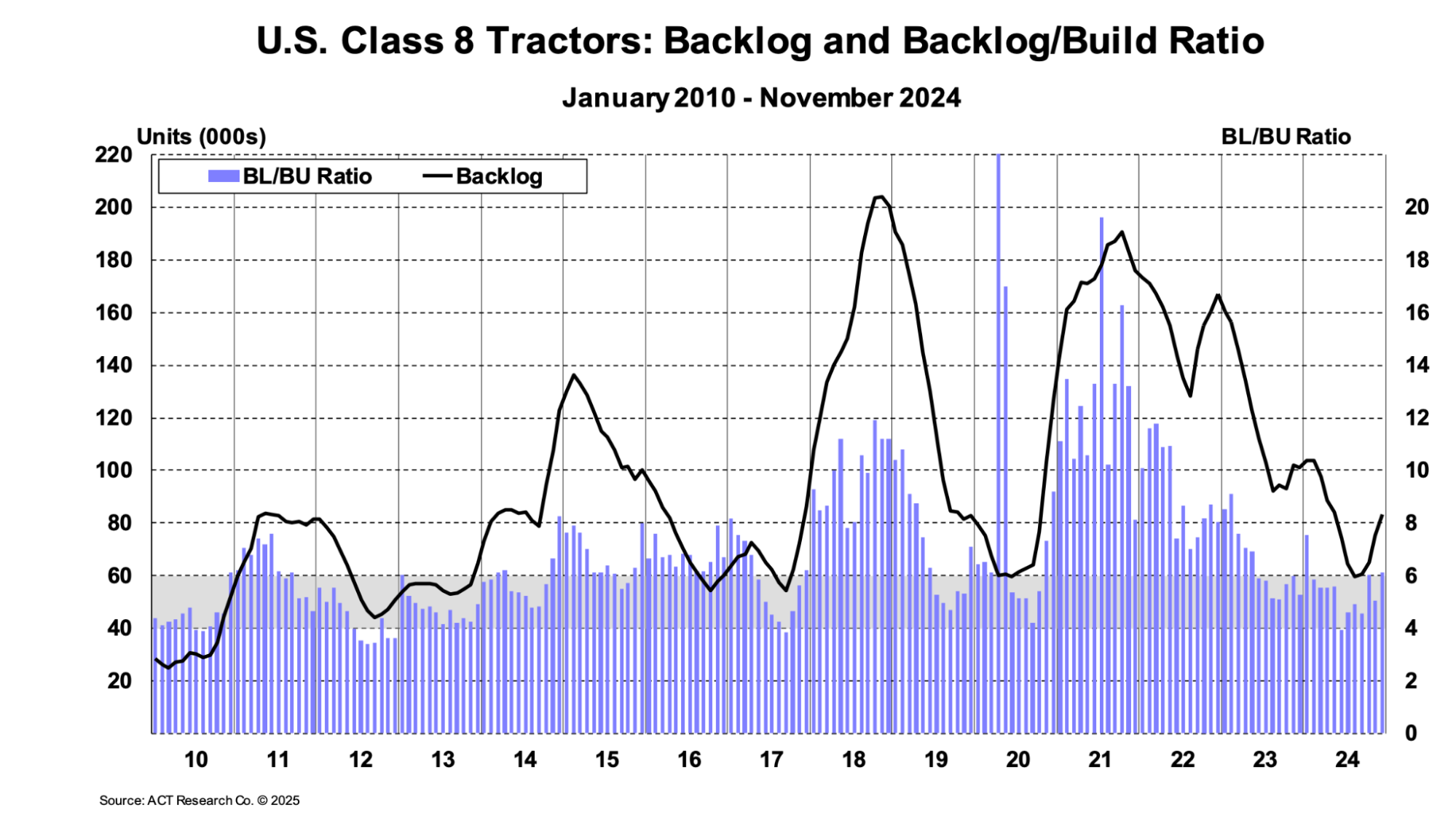 According to the latest data from ACT Research on U.S. Class 8 tractors, the backlog-to-build (BL/BU) ratio increased from 6.5 months in November to 7.0 months in December. The backlog also grew by more than 12,000 units to reach 87,000 in December. ACT Research reports lower build rates largely supported this growth as manufacturers continue to prioritize vocational production over tractor production. With rates still low, significant near-term growth remains unlikely.