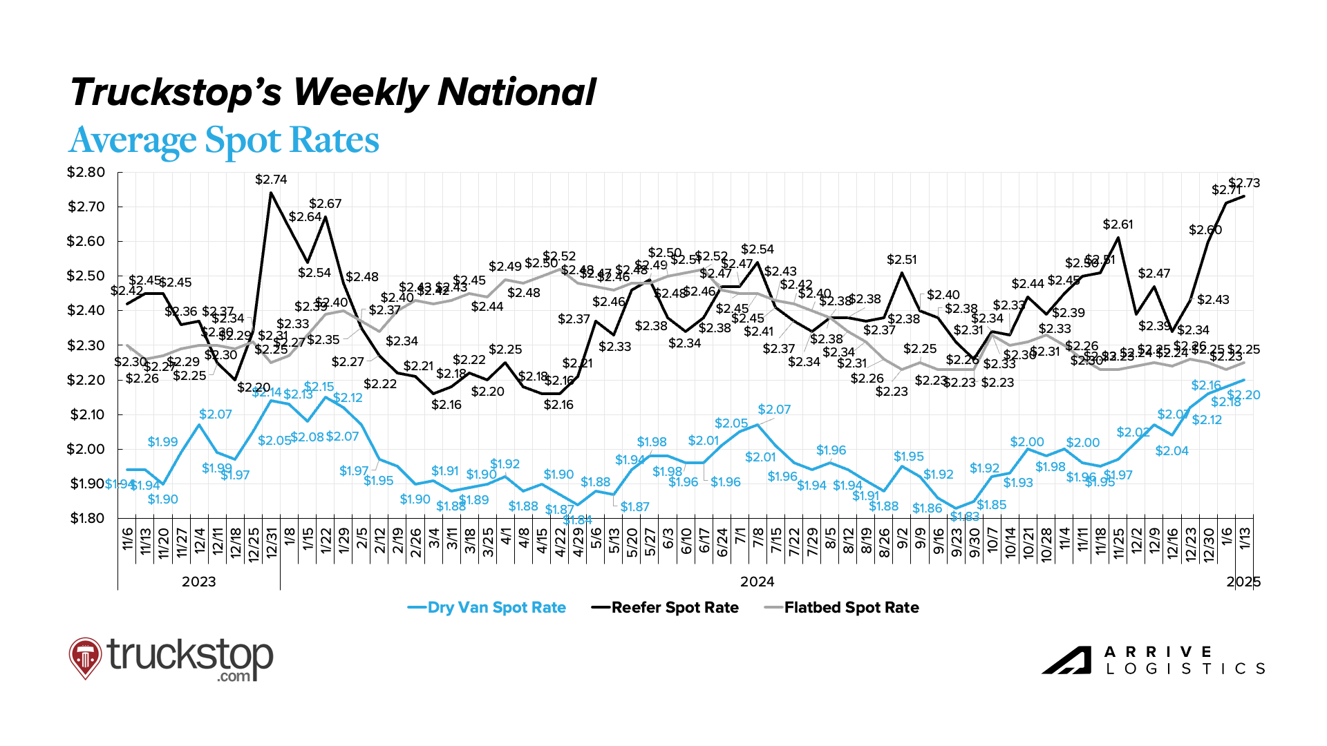 Reefer rejection rates surpassed 20% for the first time in over two years around Christmas and remain above 18% amid the ongoing impact of winter storms. A similar trend emerged last year as consecutive winter storms drove reefer rejection rates above 10%. Given the forecast for more cold temperatures, reefer rejection rates could create additional spot rate volatility for most of January before likely declining later in Q1.
