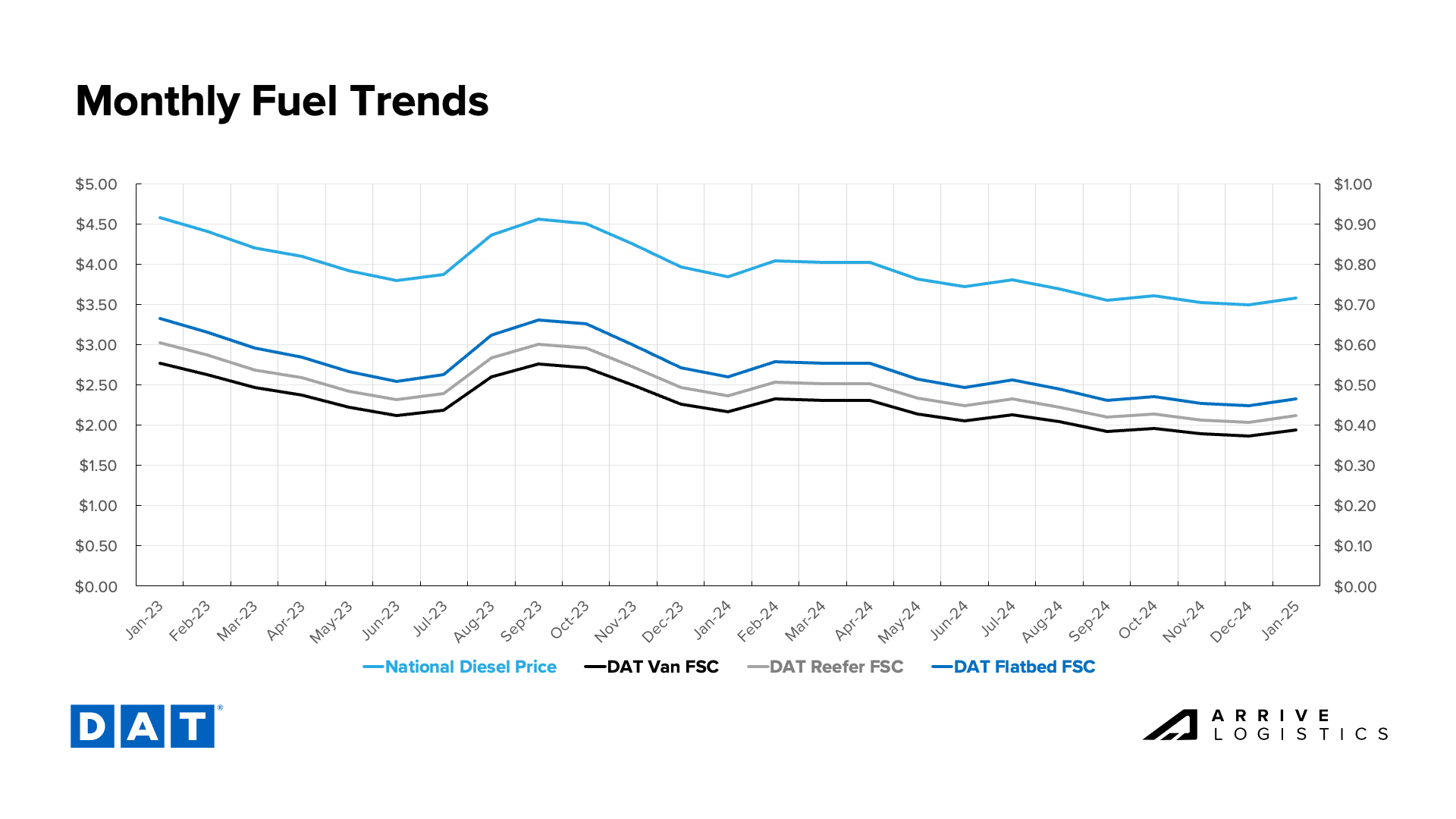 National diesel prices continued ticking down through the year-end, with the December average landing at $3.49 per gallon. Low fuel prices continue to benefit carriers who are navigating high operating costs amid low revenues. The EIA’s fuel outlook remains favorable for carriers, calling for an average price of $3.61 per gallon in 2025, down from $3.78 per gallon in 2024.