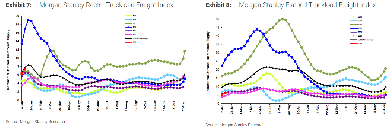 The Morgan Stanley Dry Van Freight Index is another measure of relative supply; the higher the index, the tighter the market conditions. The black line with triangle markers on the chart provides a great view of what directional trends would be in line with normal seasonality based on historical data dating back to 2007. The data deviated from the 10-year average toward the end of 2024; in fact, only 2021 ended the year with a higher reading, indicating market conditions are the tightest they’ve been since early 2022.