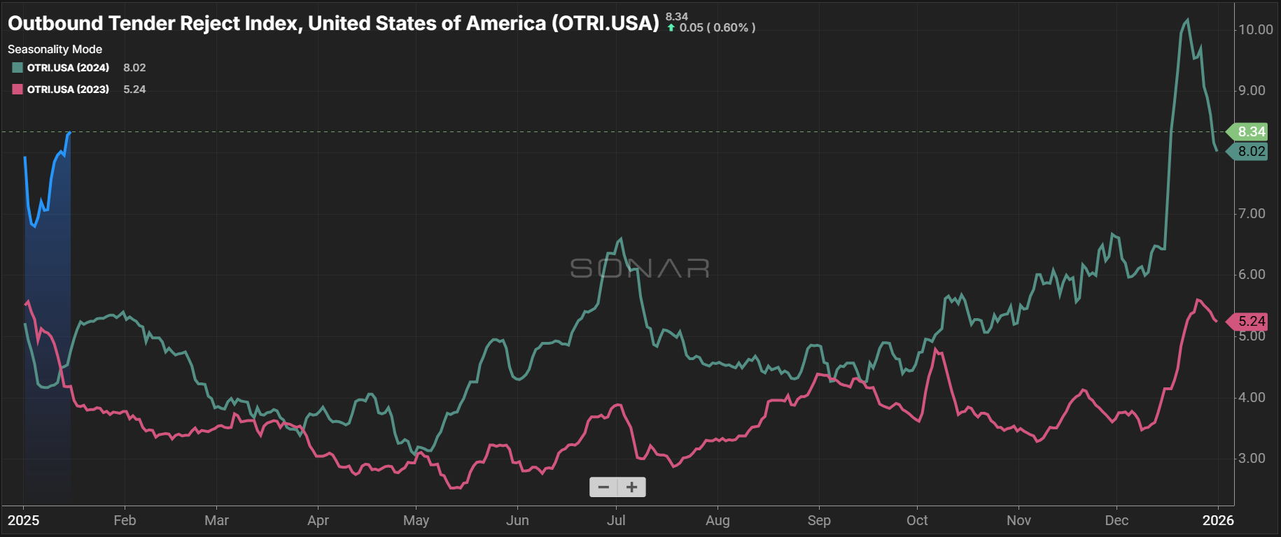 Dry van-specific tender rejections approached 9% around Christmas, fell below 8% by year-end, and spiked again in early January amid highly disruptive winter storms. Today, rejection rates are ahead of what they were around the 2024 summer peak and well above the highest level in 2023, confirming that routing guides are becoming more sensitive to disruption.