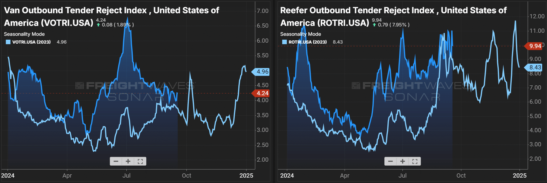 The Sonar Outbound Tender Reject Index (OTRI), which measures the rate at which carriers reject the freight they are contractually required to take, remains closely in line with September 2023. There has been no significant routing guide disruption since the Fourth of July, which should continue, save for any unforeseen events. 2023 curves on the van and reefer tender rejection charts are a strong predictor of routing guide challenges as the year progresses.
