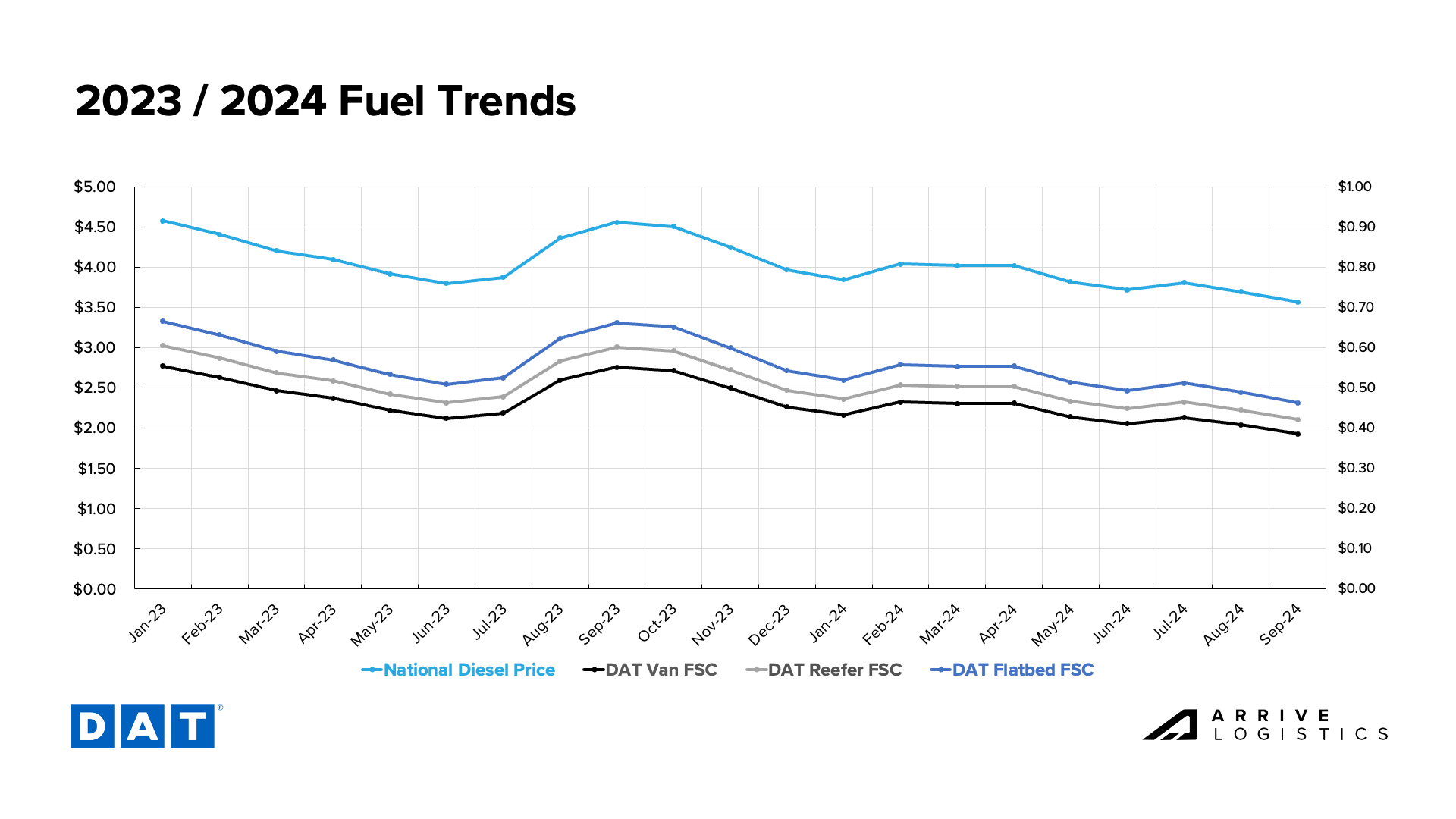 National diesel prices continue to decline steadily, offering relief to carriers with lower fuel efficiency. The decline comes amid elevated domestic fuel inventories, strong production and falling demand. Though Hurricane Helene created some temporary fuel price volatility, overall, prices should remain low.