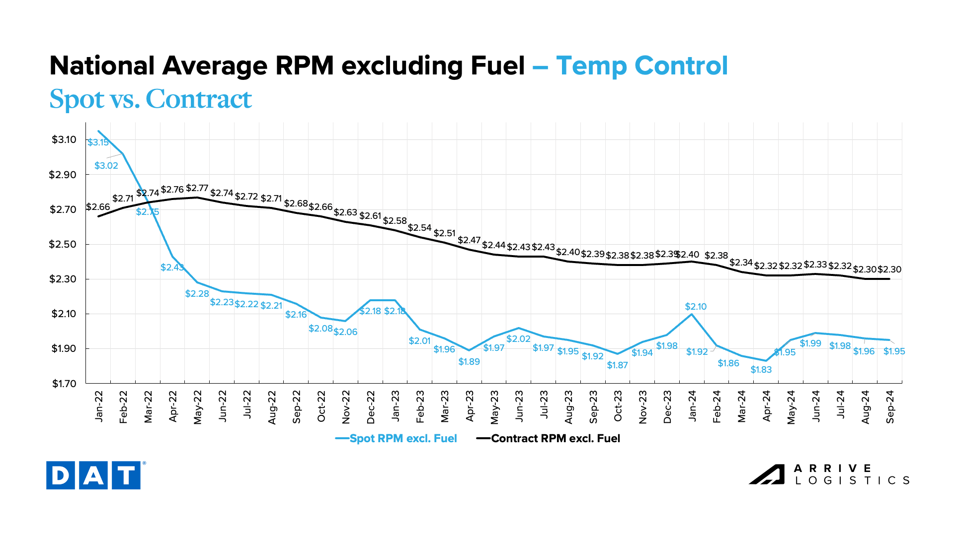 The reefer market has settled, with trends mirroring the dry van market. Month-over-month spot rates were flat through mid-September, hovering around $1.96 per mile. Temp control rates were flat through the summer, but we expect them to tick up later in Q4, especially in northern states. Contract rates have remained stable, limiting the pressure of a closing spot-contract rate gap, although conditions are slightly tighter than for dry van freight.