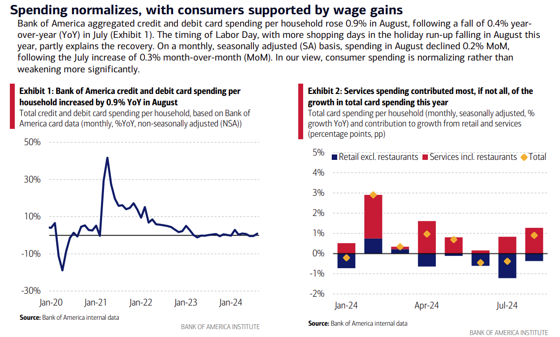 Bank of America continues to show credit card spending stability, reporting a 0.9% year-over-year increase in August that was aided by the timing of Labor Day, which allowed for more “shopping days” this year. As a result, seasonally adjusted spending was down 0.2% in August. Goods spending declined year-over-year, with only February and March showing year-over-year growth. Additionally, back-to-school spending was weaker than in 2023, which could have resulted from declining inflation.