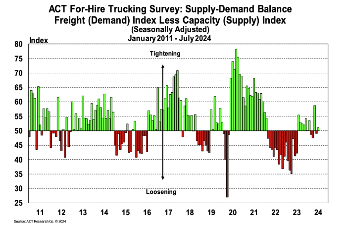 The ACT For-Hire Trucking Supply-Demand Balance Index rose from 49.0 in June to 51.1 in July, likely due to growing freight volumes and declining fleet capacity. However, it is important to note that ongoing private fleet expansion is not captured in this data. As the U.S. economy continues to rebound, increasing freight volume should be an upside risk in 2025.