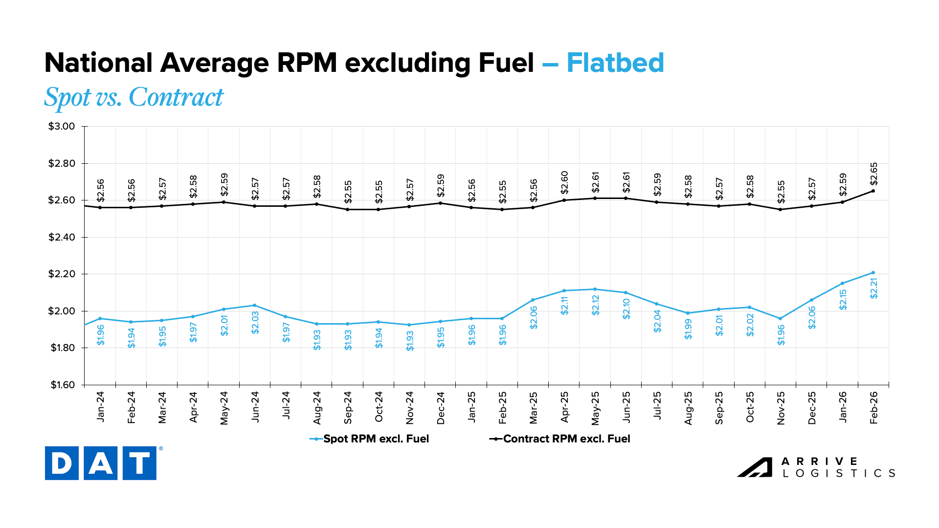 As of mid-month, spot rates across van, reefer and flatbed remain meaningfully elevated on a year-over-year basis, with some still sitting at or above contract levels. Even with volumes down year-over-year, supply is showing significant cracks as high operating costs, ongoing trucking employment declines and regulatory enforcement continue to reduce the driver count and shrink available capacity.