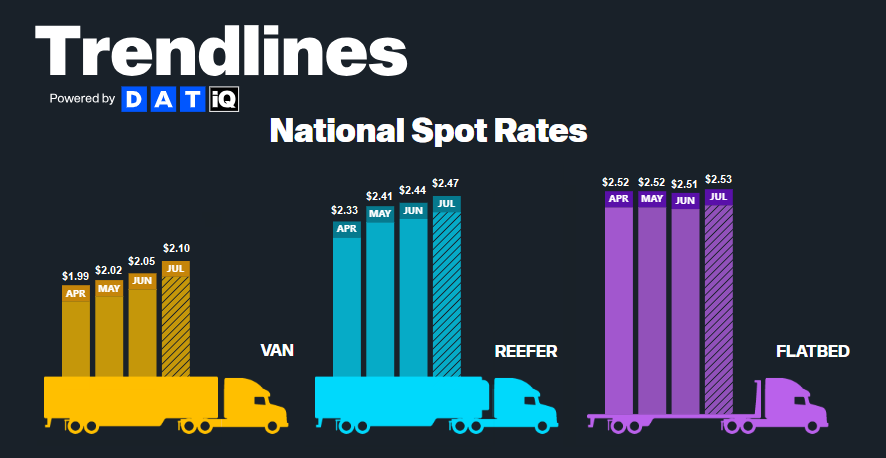 According to DAT, all-in spot rates across the three major modes have increased month-over-month in July. Dry van leads the way, with rates rising by $0.05 to $2.10 per mile. As the end of the month draws near, rates should fall closer to June averages.