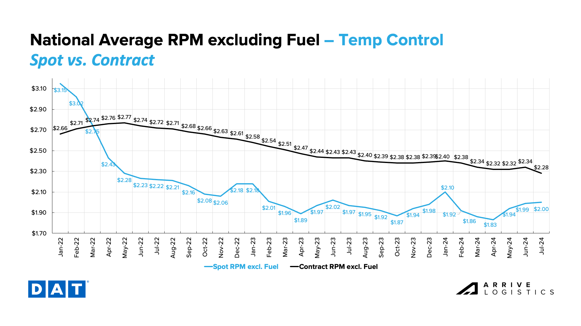 Recent volatility confirms that the temp controlled market recovery is further than dry van. Reefer linehaul rates approached $2.00 per mile in June and hit it in early July, marking the first time since January rates have reached this level. Contract rates have declined significantly in July but should soon normalize back to June levels.