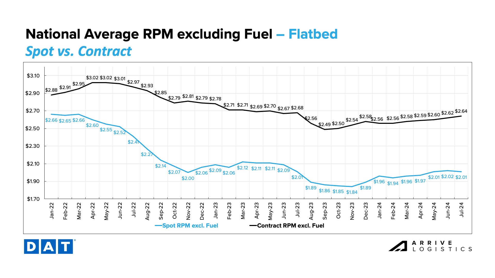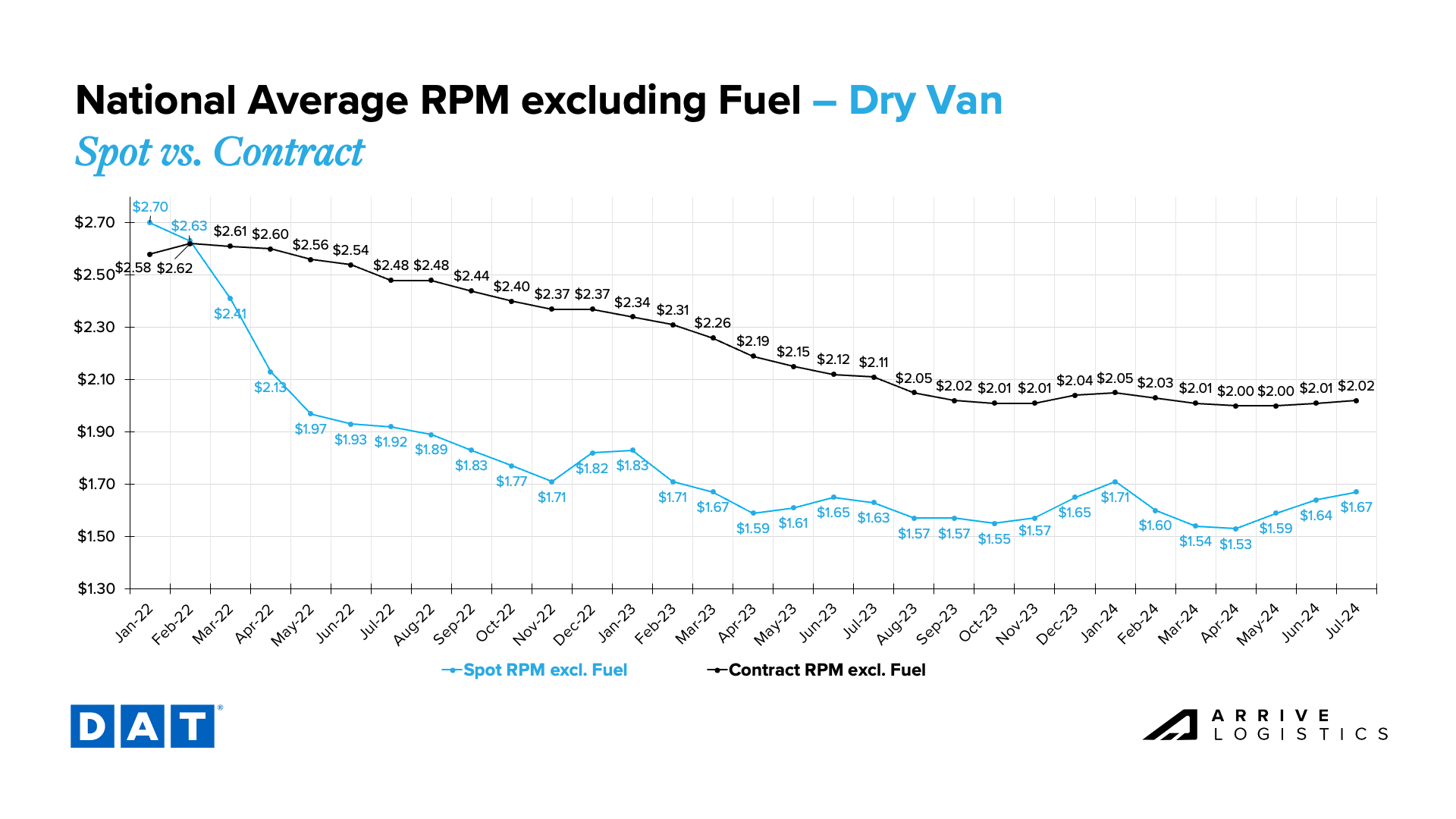 In Q2 and early Q3, the CLAV index showed relatively strong contract volumes compared to historical levels. Overall, volumes were up nearly 8.6% month-over-month in early July, largely driven by dry van freight, which increased 8.1%. Reefer volumes regressed slightly, declining 0.9% month-over-month.