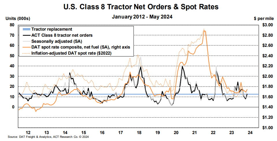 ACT Research reported 7,500 Class 8 truck orders in June, down from 11,000 in May. The decline is unsurprising as orders tend to soften during the summer. However, orders have fallen below replacement levels in four of the last five months, which could be a positive sign for those waiting for the capacity market to shrink.