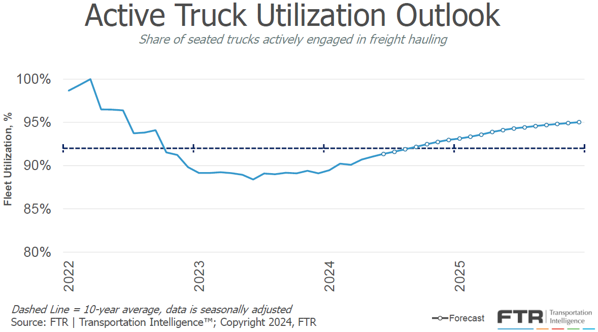 FTR revised its truck utilization forecast downward due to a weaker freight outlook. However, it is clear that utilization bottomed out in mid-2023 and has consistently ticked up since. Active utilization was 91% in May 2024, one percentage point below the 10-year average, and will likely approach 93% by the start of 2025 — another sign that the market is moving toward balance.