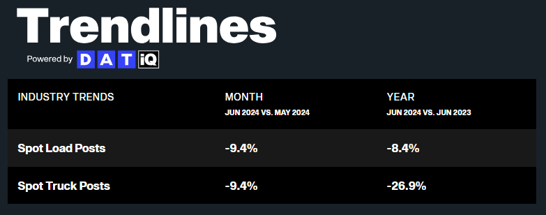 Spot truck postings declined sequentially, falling 9.4% from May and 26.9% from June 2023. This trend likely resulted from carriers posting fewer trucks and instead spending more time searching for loads.