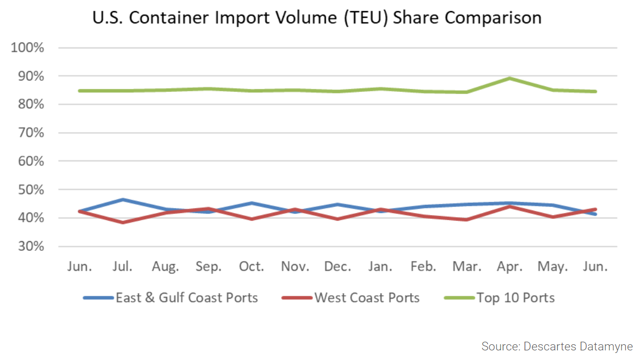 Descartes’ June import data deviated slightly from the NRF’s projections, showing a 2% decrease from May. However, volumes were still up over 10% year-over-year, indicating a strong import market.