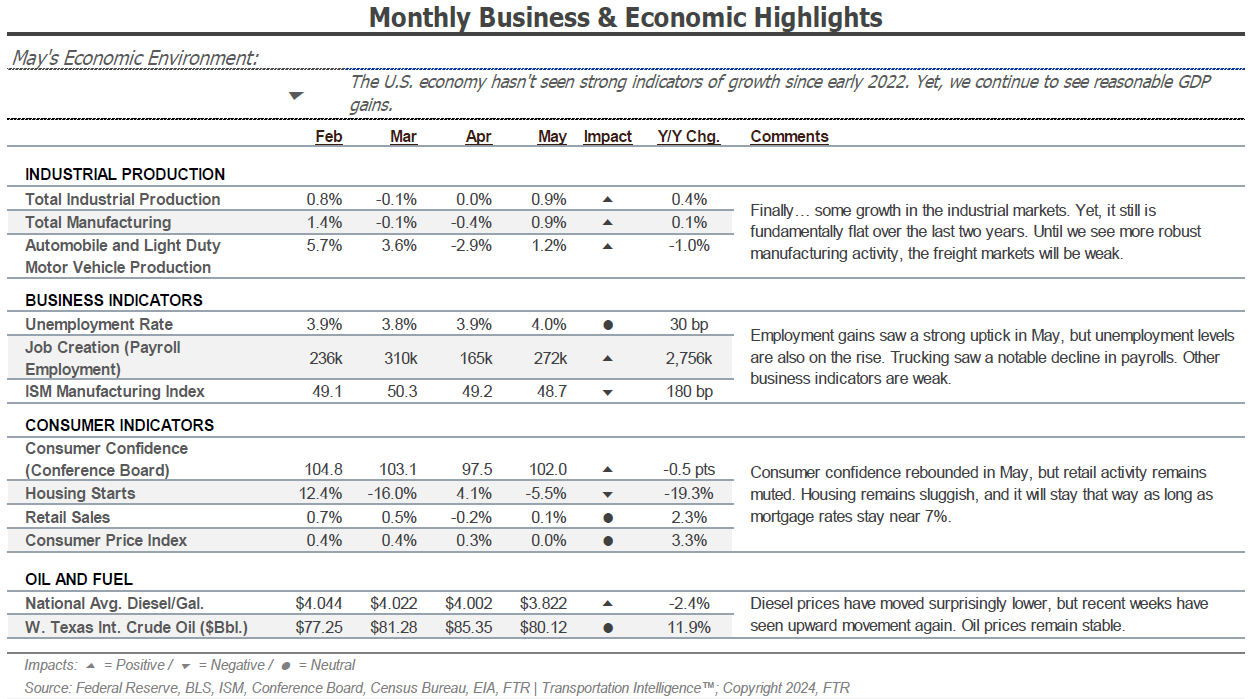Overall, consumer health indicators still look relatively strong. Industrial production and manufacturing increased by 0.9% month-over-month, but the sector remains relatively flat year-over-year. Housing starts declined 5% month-over-month and nearly 20% from May of last year and will likely remain low amid high mortgage rates. Thus, truckload demand remains flat, but we will continue to monitor these industries as key drivers of freight demand fluctuations.