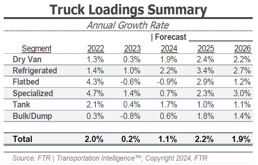FTR’s latest truck loadings forecast calls for a 1.1% year-over-year increase by the end of 2024, a downward revision from last month’s 1.8% projection. The 2025 forecast was revised from 2.4% last month to 2.2%, largely driven by an updated bulk and dump loadings forecast that calls for 0.6% growth by year-end, down from the 3.6% projected last month. The remaining modes were relatively steady despite slight downward revisions. These changes reflect a market that is likely to be slow for most of the year.