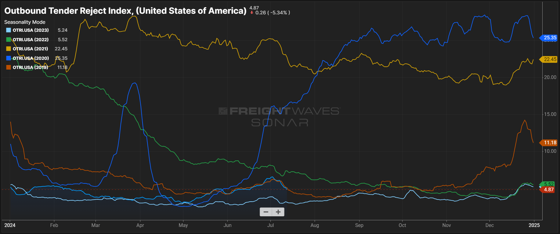 The persistently wide spot-contract spread should keep the market safe from disruptions. As this stage of the market cycle continues, it should lead to conditions for sustained routing guide disruption in 2025.
