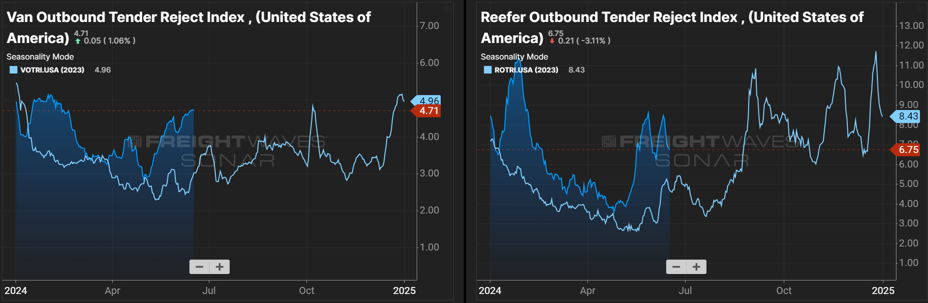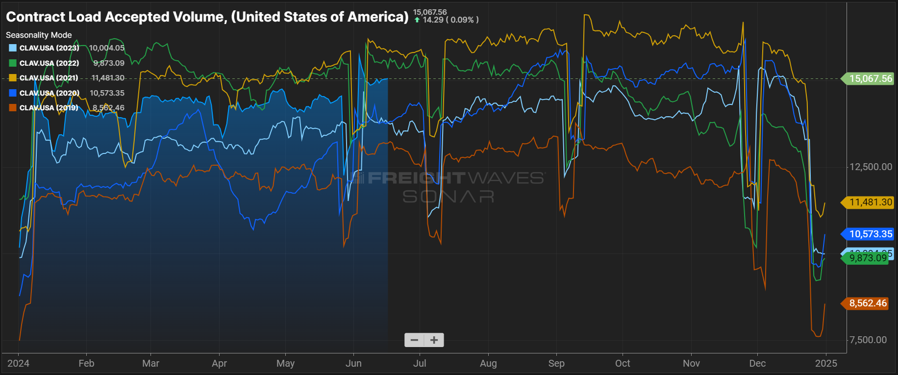 Our outlook for rate conditions remains unchanged: In the short term, rates will follow normal seasonal patterns, ticking up before the Fourth of July and pulling back shortly after. Our longer-term outlook calls for more downward pressure on contract rates, leading to a closing of the spot-contract rate gap and forcing more exits on the carrier and broker side of the equation. This is the next stage of the market cycle and should create conditions that make a more sustained routing guide disruption in 2025 possible.