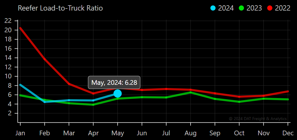 The DAT Load-to-Truck Ratio measures the total number of loads relative to the total number of trucks posted on its spot board. The May reading ticked up for the third consecutive month, rising to 4.39. Such month-over-month increases are typical in May — in fact, this year’s load-to-truck reading was almost identical to May 2022. The reefer load-to-truck ratio increased month-over-month but not as significantly, reaching 6.28. It also increased from May 2023 but was below May 2022.