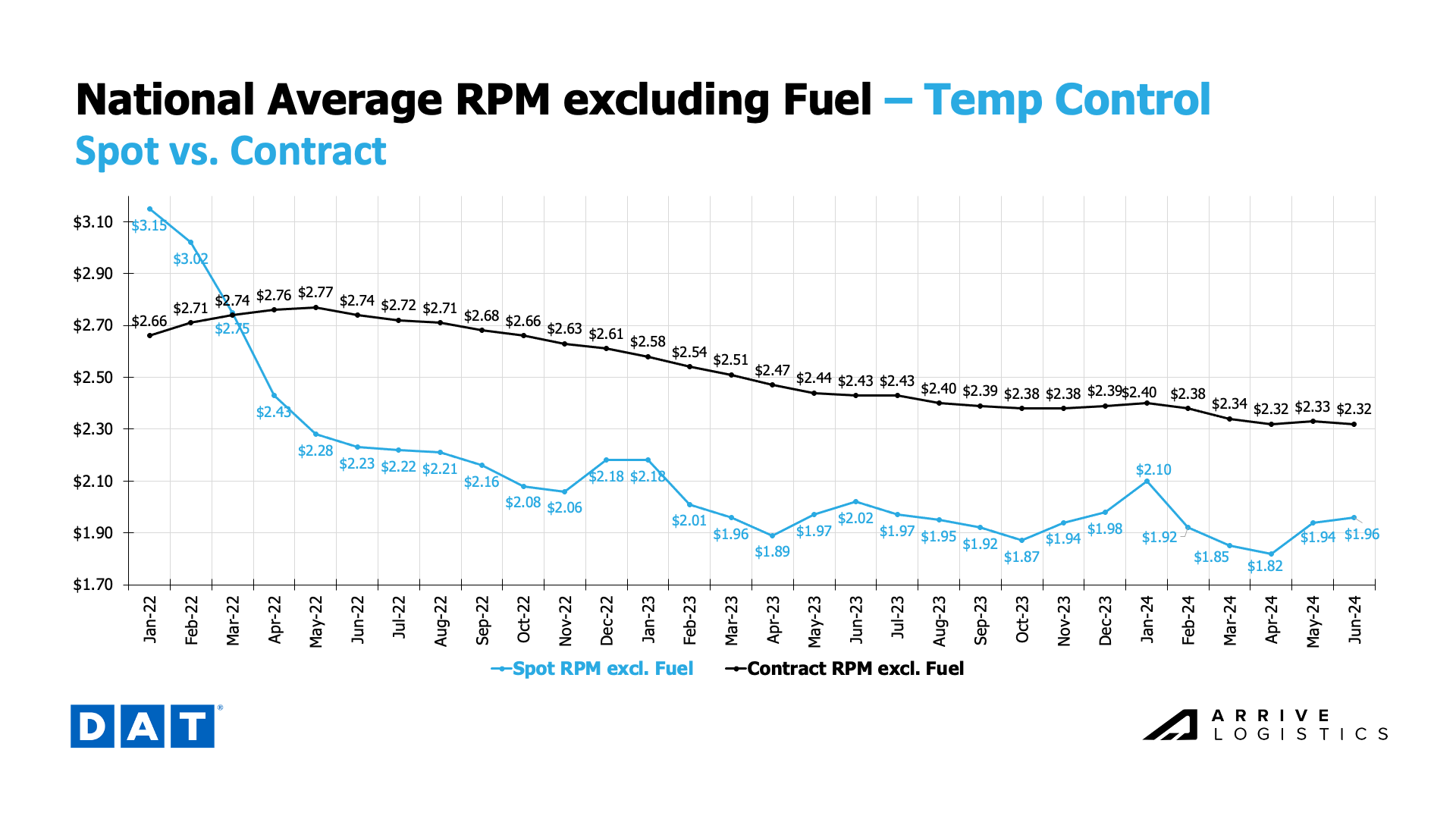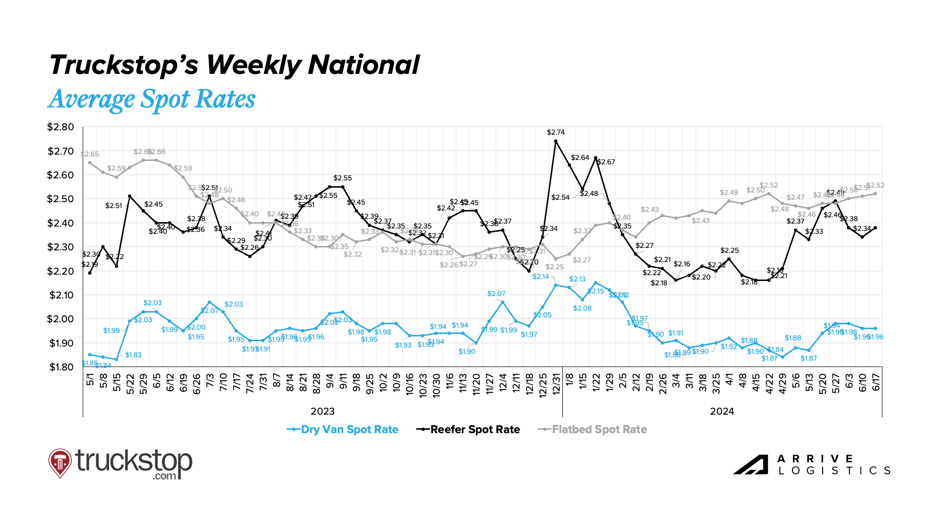 Reefer linehaul rate trends have also matched seasonal expectations, with month-over-month spot rate increases in May and June. The $0.12 per mile jump from April to May was the largest month-over-month increase since January. As of mid-June, reefer spot rates have flattened slightly to $1.96 per mile, excluding fuel. Despite increased volatility, reefer spot rates remain down year-over-year. Rates continue to decline slowly on the contract side, averaging $2.32 per mile in June, $0.12 per mile lower than last year.
