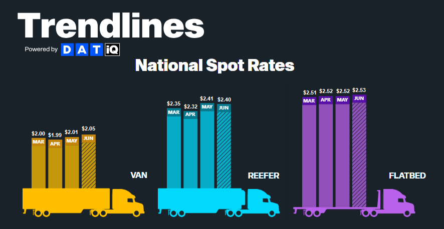 According to DAT, all-in spot rates for dry van and reefer rose in May by $0.02 and $0.09, respectively, while flatbed rates remained steady. As of mid-June, dry van and flatbed rates have ticked up slightly, and reefer rates have regressed by $0.01. These trends align with expectations for early June and indicate normal seasonal pressures.