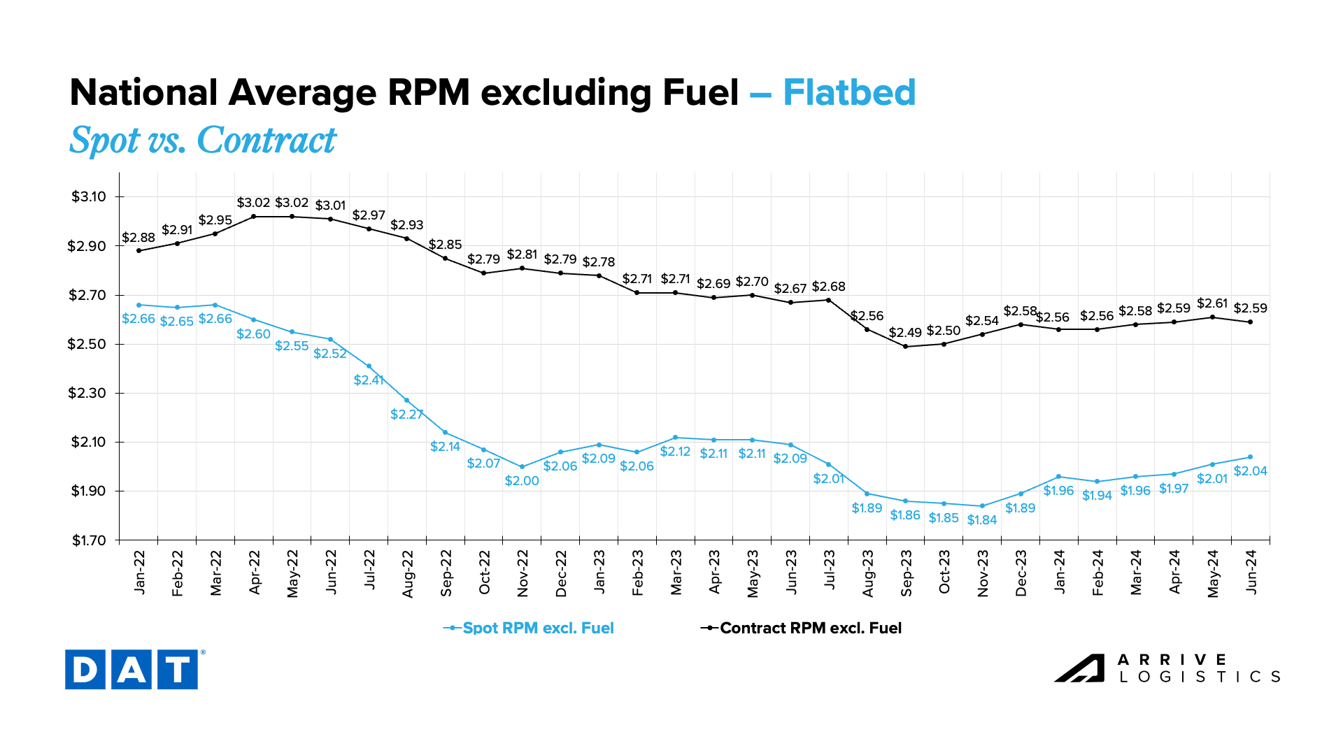 Flatbed spot rates ticked up for the fourth consecutive month, while contract rates declined for the first time since January. The spot rate increase comes amid growing demand for heavy equipment and project-based freight. In June 2023, rates rose before dropping relatively quickly over the following months. While a similar drop is unlikely, spot rates could begin to flatten.