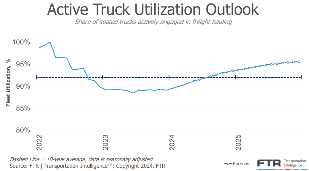 FTR’s truck utilization forecast shows that utilization bottomed out in 2023 but has started to tick up as carriers are making moves to right size their fleets. Less can afford to keep drivers seated in underutilized trucks at this point in the cycle as Shipper requested contract pricing discounts have continued to lead to margin erosion for carrier profits. Their forecast calls for additional increases in truck utilization throughout 2024 and into 2025.