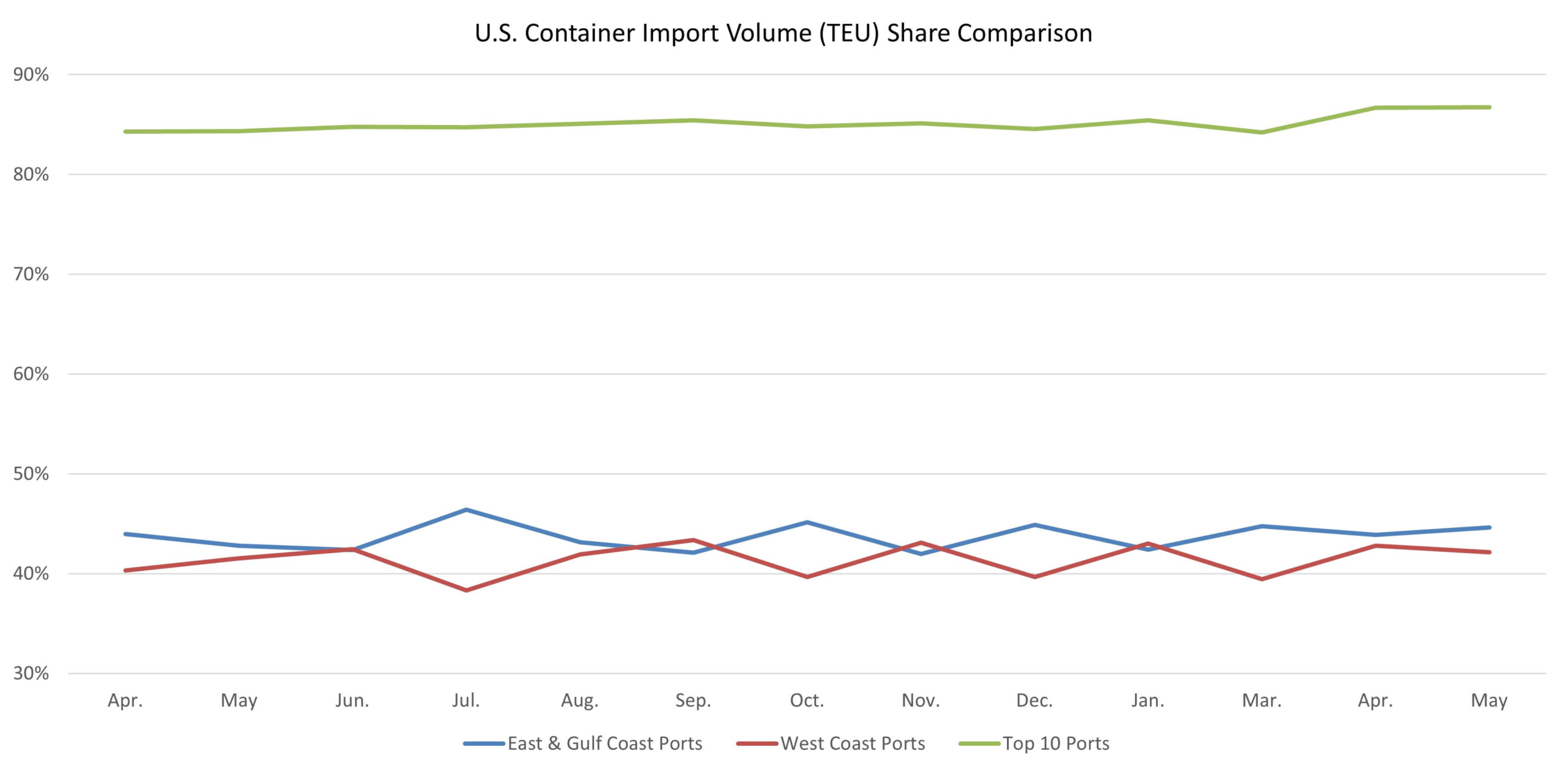 Descartes’s import data aligns with the NRF’s, showing over 2.3 million TEUs in May, a nearly 12% increase year-over-year and the highest number of imports since August 2022. Volumes got a significant boost from Chinese imports, which were up over 17% from April. The volume surge from China is unsurprising as retailers remain focused on restocking and shippers look to import goods before tariffs on Chinese imports increase starting in August. The East & Gulf Coast ports continue to handle slightly more imports than West Coast ports.