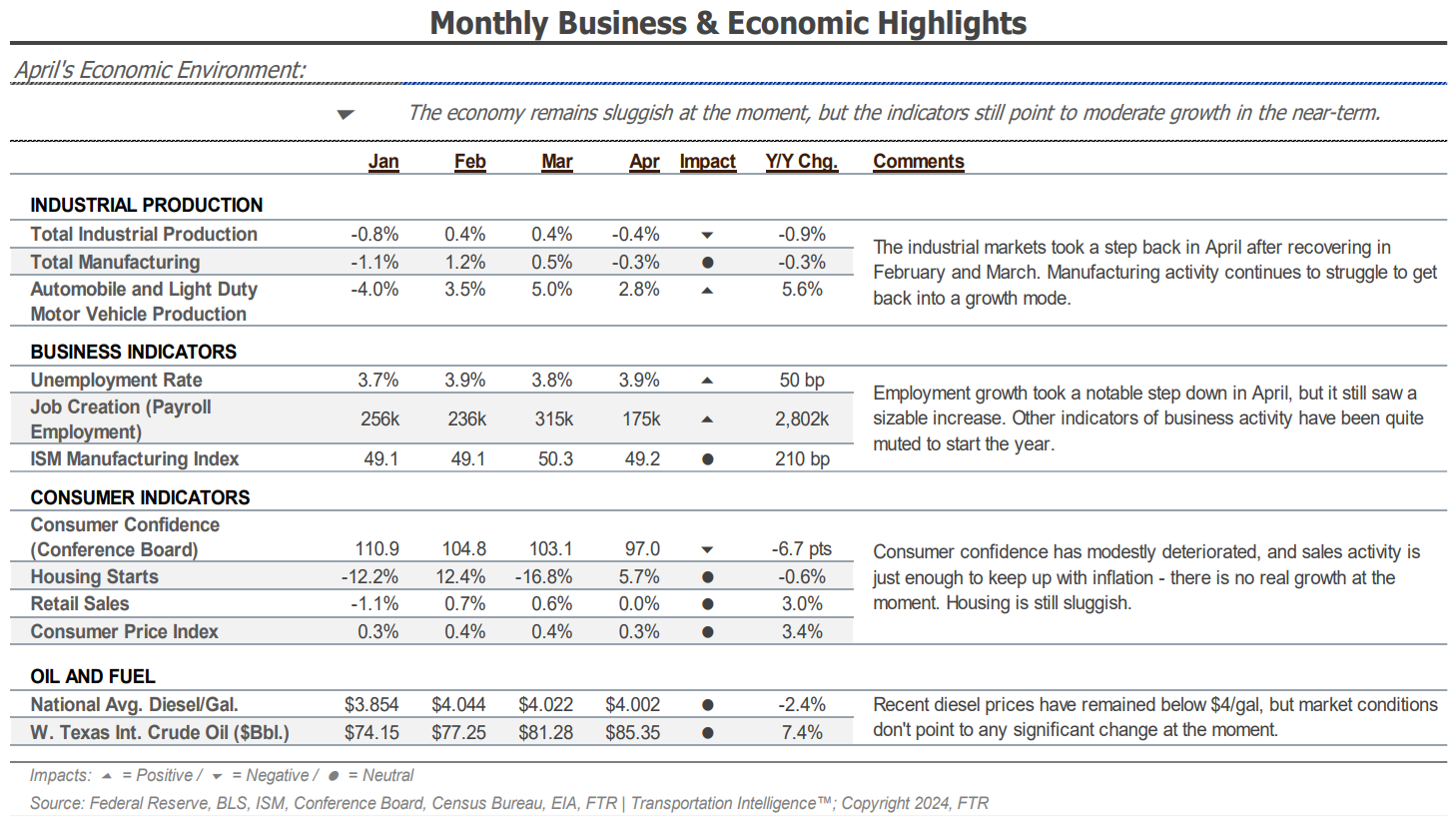 CPI data was down from 3.4% in April to 3.3% in May, which is good news for consumers. The Fed announced that a single rate cut is likely in 2024, indicating that they believe that inflation will continue to cool. Rate cuts will likely trigger an increase in economic activity and spending as the cost of borrowing money declines. Ultimately, this will lead to increased freight demand, but it will still be several months before that demand materializes. We caution this being a trend of focus, as it is likely that rate cuts will also be accompanied by other less positive economic data, which could more than offset any gains that would come from slight declines in interest rates.