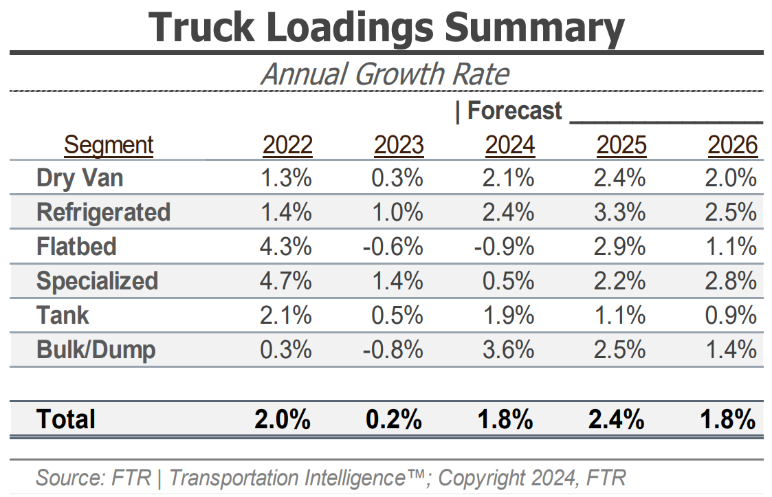 FTR’s latest truck loadings forecast calls for 1.8% year-over-year growth in 2024, a positive revision from the 0.3% increase projected last month. Bolstering the change is a 3.6% projected increase for bulk freight, which just last month was expected to end the year down 2.2%.