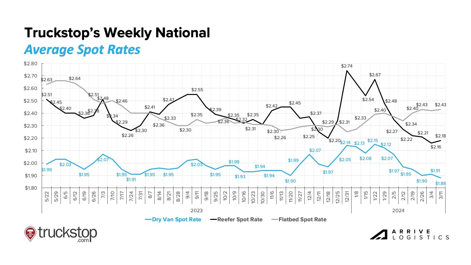 Reefer rates continue to follow the same trend as dry van but at a more magnified level. Linehaul spot rates sit at $1.84 per mile in March, a 12% decline from January and a 4% decline from February. Contract rates have declined by $0.02 per mile, excluding fuel, and continue to get downward pressure from lower spot rates. However, increased volatility means the reefer market recovery still outpaces dry van.