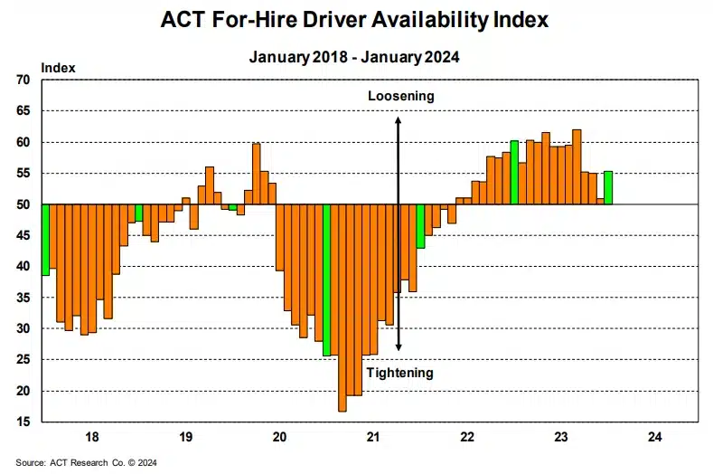 ACT’s Driver Availability Index increased by 4.5 points in January after dropping in December, likely due to owner-operators choosing to close rather than pay annual insurance and registration while rates are low. Despite loosening conditions, long-term challenges remain as retiring Baby Boomers shrink the U.S. labor force.