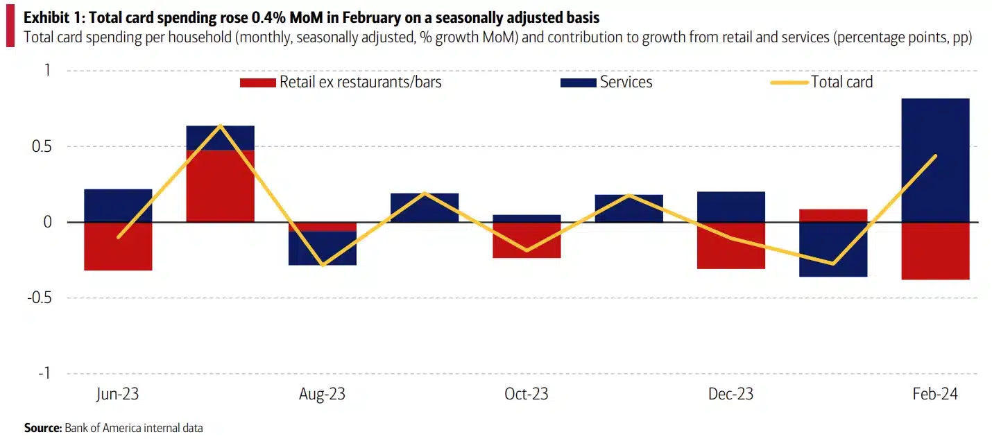 January Bank of America card data showed card spending rose 2.9% year-over-year on a non-seasonally adjusted basis. One of the key drivers was the strong recovery of service-based spending, which rebounded from a winter-impacted January. However, this was offset by weaker spending in February compared to January. Overall, consumer spending remains stable despite elevated interest rates.