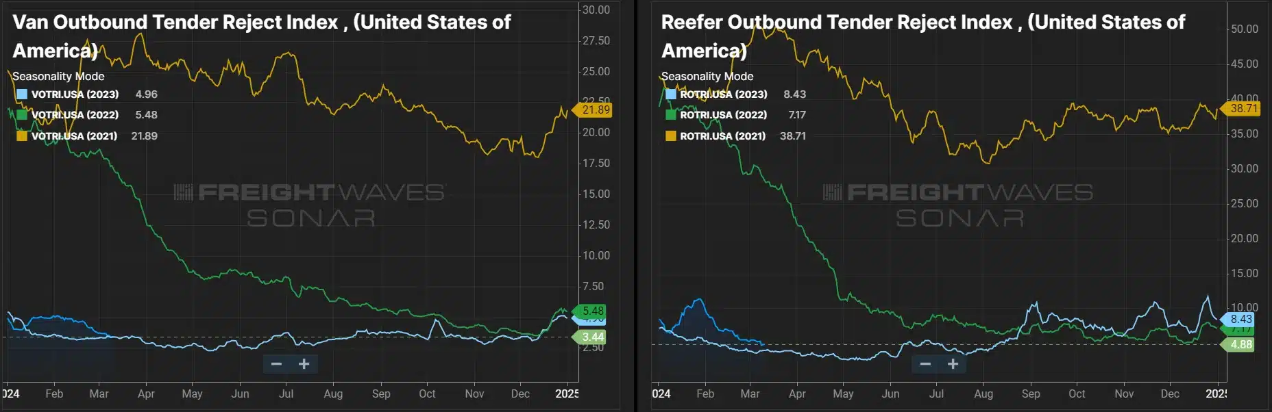 The Sonar Outbound Tender Reject Index (OTRI), which measures the rate at which carriers reject freight they are contractually required to take, hovered over 5% for most of February and remains relatively flat year-over-year despite a jump in early 2024. The tender rejection rate decline in February followed typical seasonality as shippers prepare for produce season and the 100 days of summer.