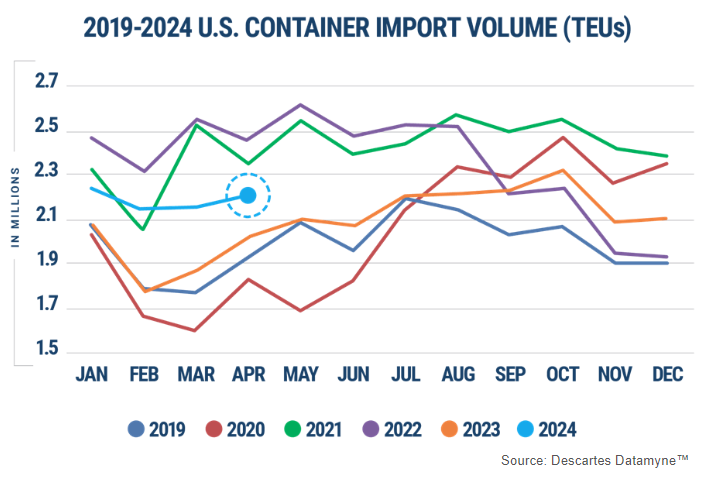 Figure 23: U.S. Container Import Volume 2019-2024, Descartes April 2024 Global Shipping Report