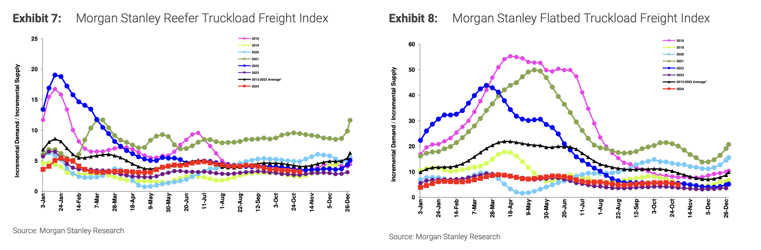 The Morgan Stanley Dry Van Freight Index is another measure of relative supply; the higher the index, the tighter the market conditions. The black line with triangle markers on the chart provides a great view of what directional trends would be in line with normal seasonality based on historical data dating back to 2007.
