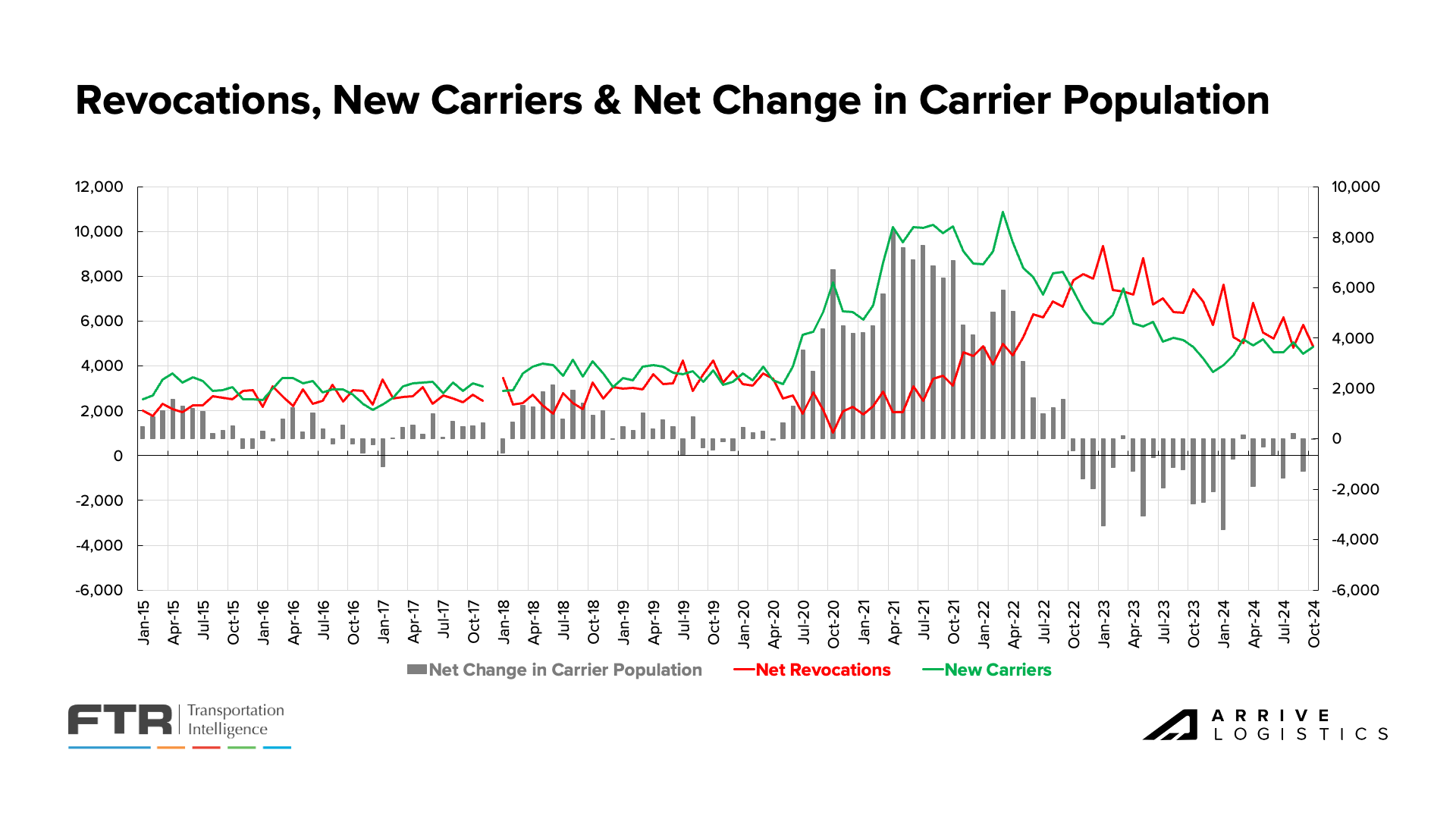 Resilient carriers continue to exit the market slower than in previous months. October revocation data shows over 4,800 carrier entrants and exits. As a result, the net change in the overall carrier population was effectively zero. Recent disruptions and holiday season rate increases, paired with recent fuel price declines, are offering many carriers a sense of stability that could keep them in the market longer.