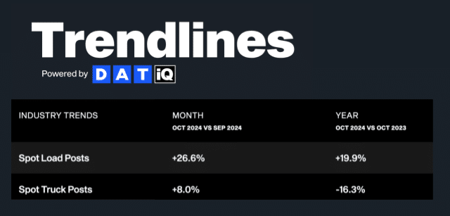DAT reports that October spot loadings were up 26.6% from September and nearly 20% from October 2023. The year-over-year increase is notable since loadings had declined by over 40% from October 2022 to October 2023. This surge likely correlates with the disruption caused by Hurricanes Helene and Milton in late September and early October, which forced contract volume into the spot market and spurred an influx of recovery-related freight.