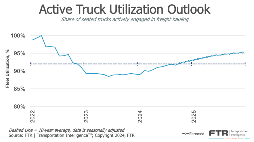 FTR’s latest truck utilization forecast remains relatively unchanged. Current utilization is nearly in line with the 10-year average of 92% and should continue to improve gradually through 2025 and into 2026. Equipment utilization improvement is a sign that fleet networks are tightening, and as that number approaches 100%, the risk of sustained disruption increases.