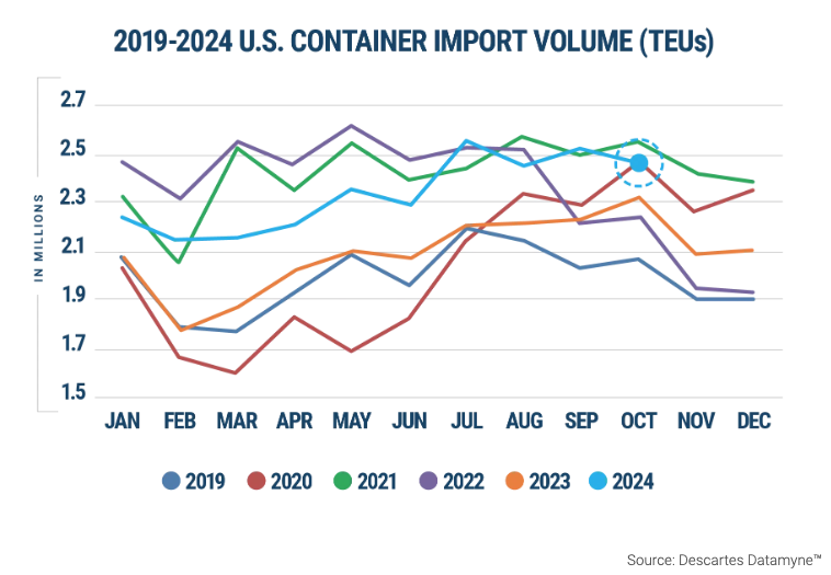 Recent Descartes data tells a similar story as the NRF forecast, showing TEU imports declined sequentially in October but remained above 2 million. The Descartes data also shows shipment declines every November for the past five years; however, if retailers continue pulling freight forward to mitigate potential strike and tariff-related risks, imports could moderate in November and December.