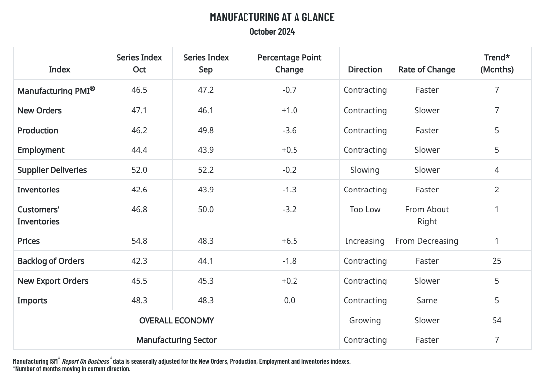 The manufacturing sector continues to contract, indexing below 50 in 23 of the past 24 months, including the last seven. The most recent reading declined by 0.7 percentage points to 46.5. However, ISM notes that a reading above 42.5 indicates economic expansion, and October was the 54th consecutive month with a reading above that threshold. As interest rates continue to decline and spending increases, manufacturing demand could grow and drive the index over 50 in 2025.