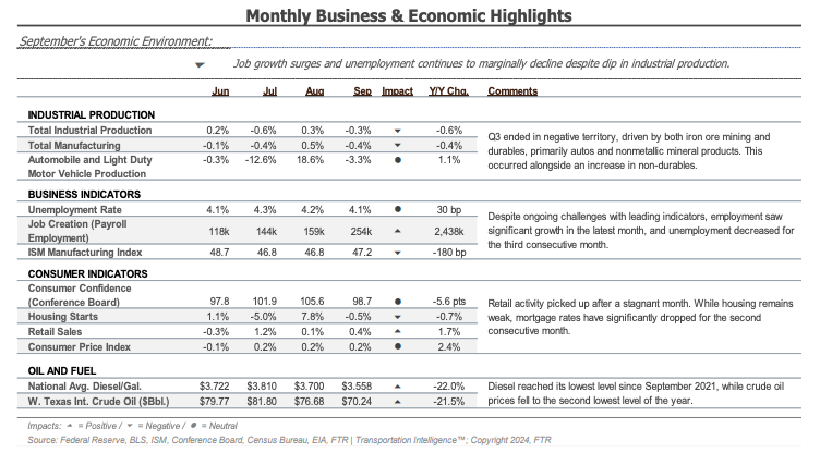 Economic trends in freight-related industries remain fluid. As industrial production and manufacturing declined, unemployment remained historically low, retail activity showed positive growth and mortgage rates fell for the second consecutive month. With interest rates dropping and the consumer market holding steady, the manufacturing and housing sectors could grow, providing a meaningful boost to overall freight demand in 2025.